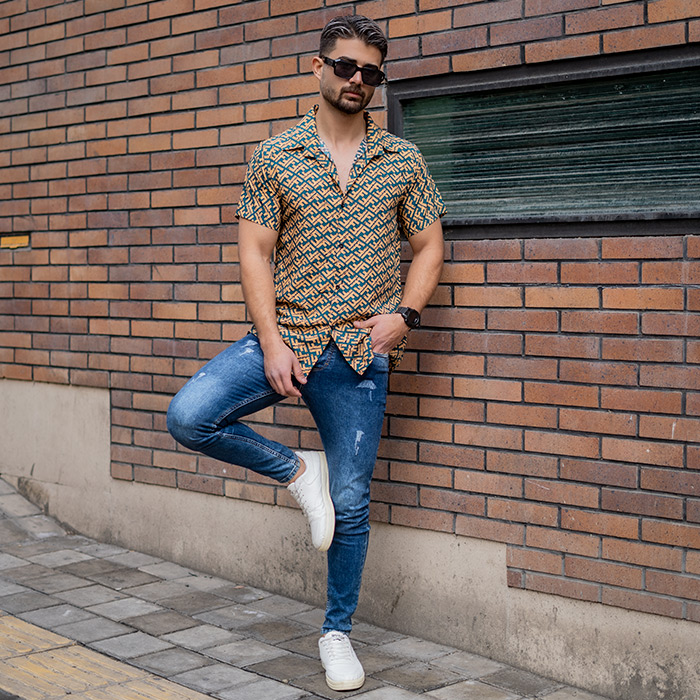 پیراهن هاوایی طرح فندی زرد مردانه مدل F82